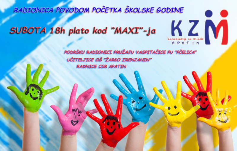 Povodom početka nove školske godine Kancelarija za mlade u saradnji sa predškolskom ustanovom "Pčelica" i osnovnom školom "Žarko Zrenjanin", a uz podršku radnika Centra za socijalni rad Apatin, organizuje kreativnu radionicu u subotu 31. avgusta sa početkom u 18 časova na platou ispred Maxija.